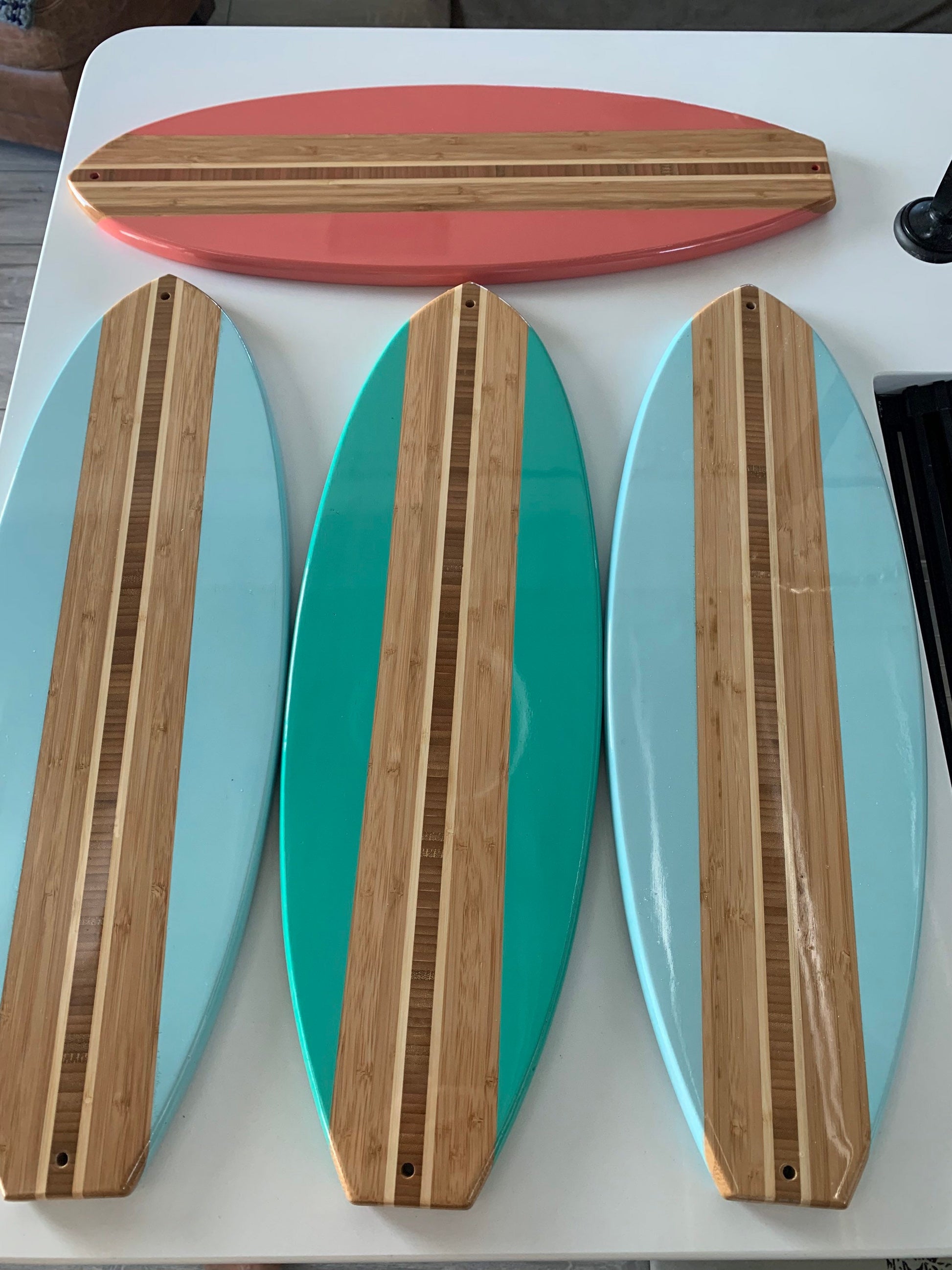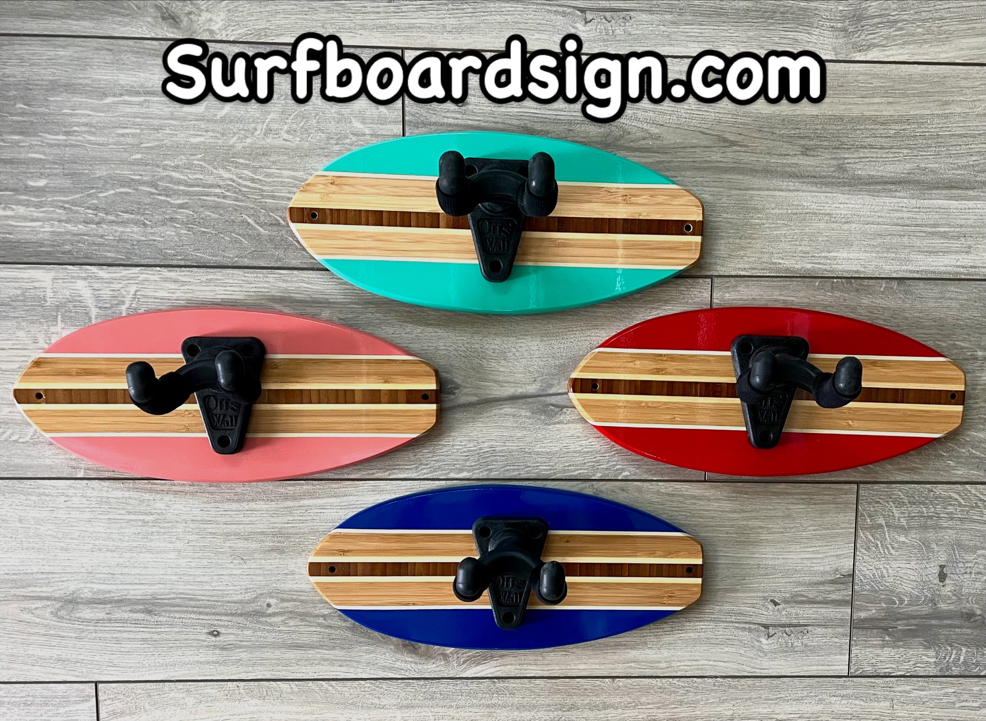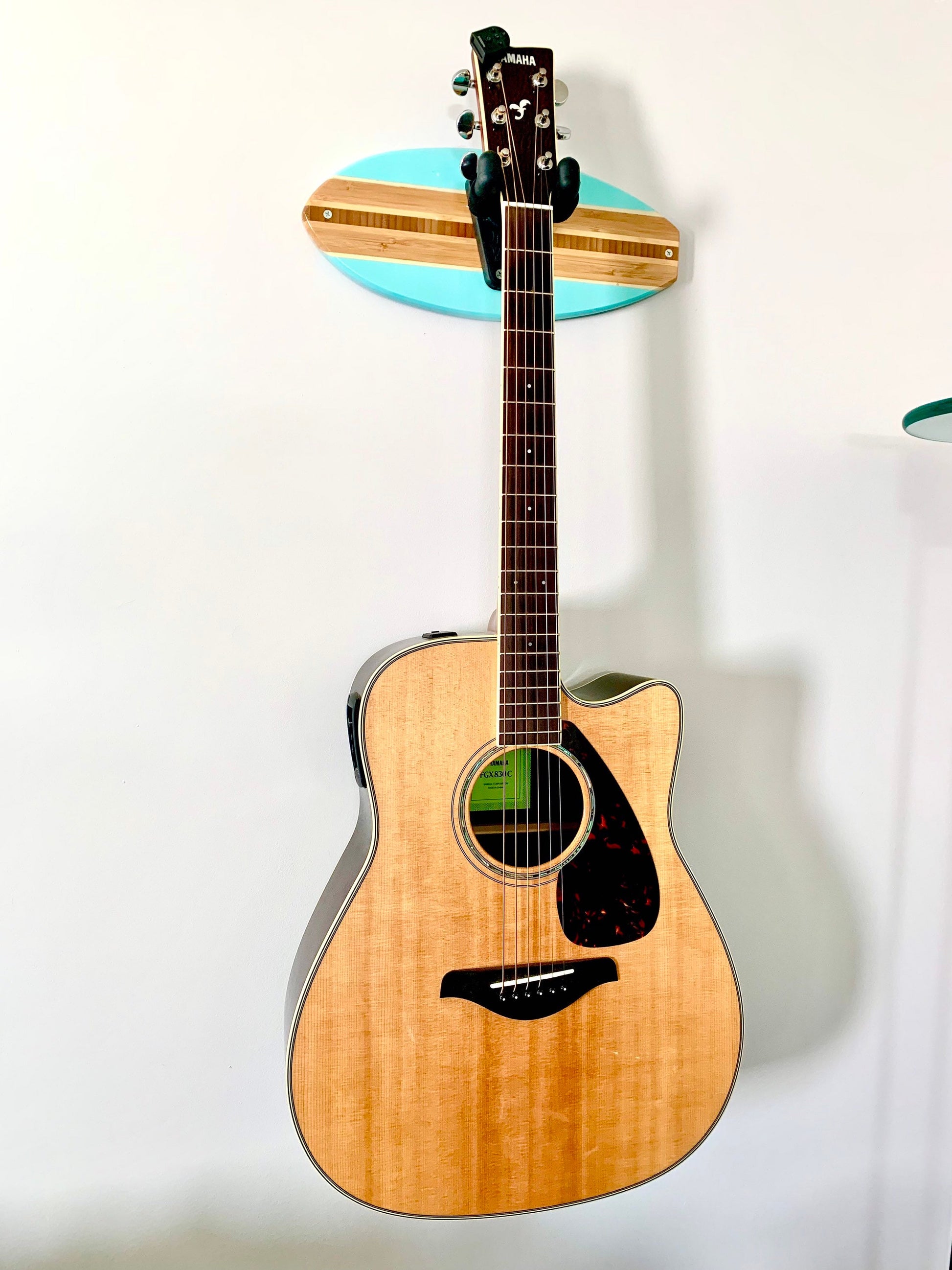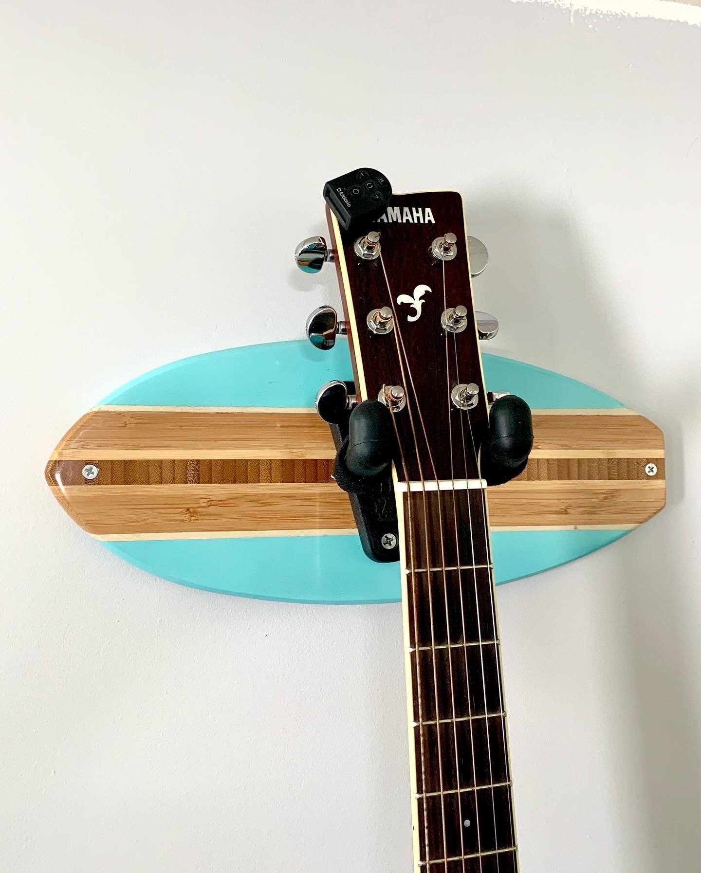 Surfboard Coastal Guitar Wall Hanger available in Beach Blue (shown), Black, Seafoam Green, Salmon, Clear, Royal Blue and pink. Made to order and finished in an automotive clear coat.