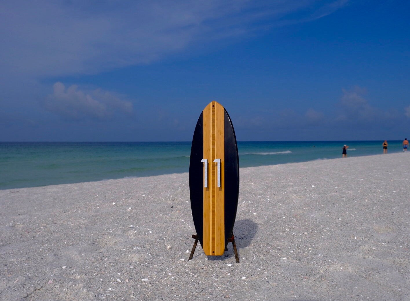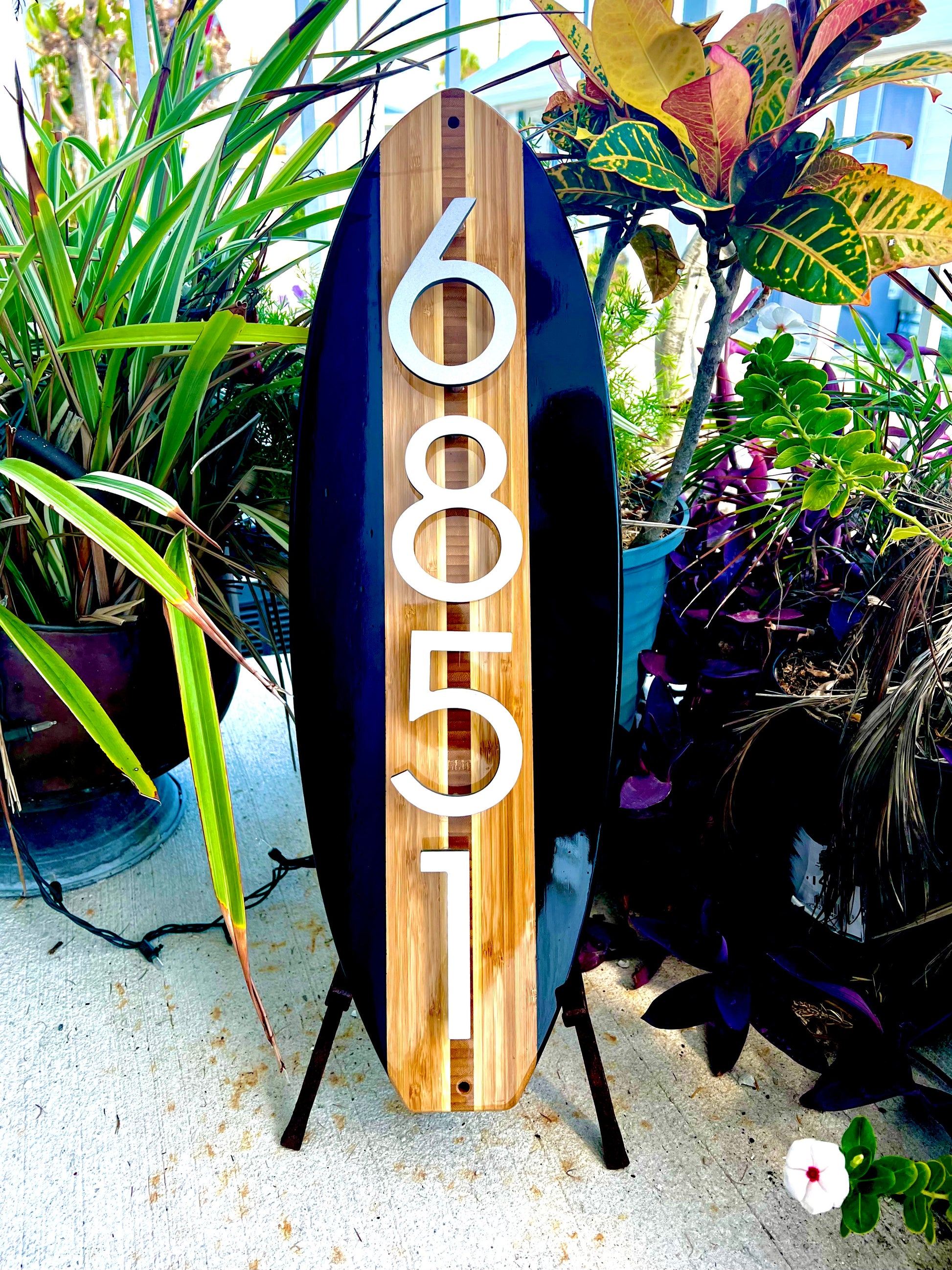 Surfboard House Address Number Plaque in Black with 3D characters, Brushed Aluminum or Black.