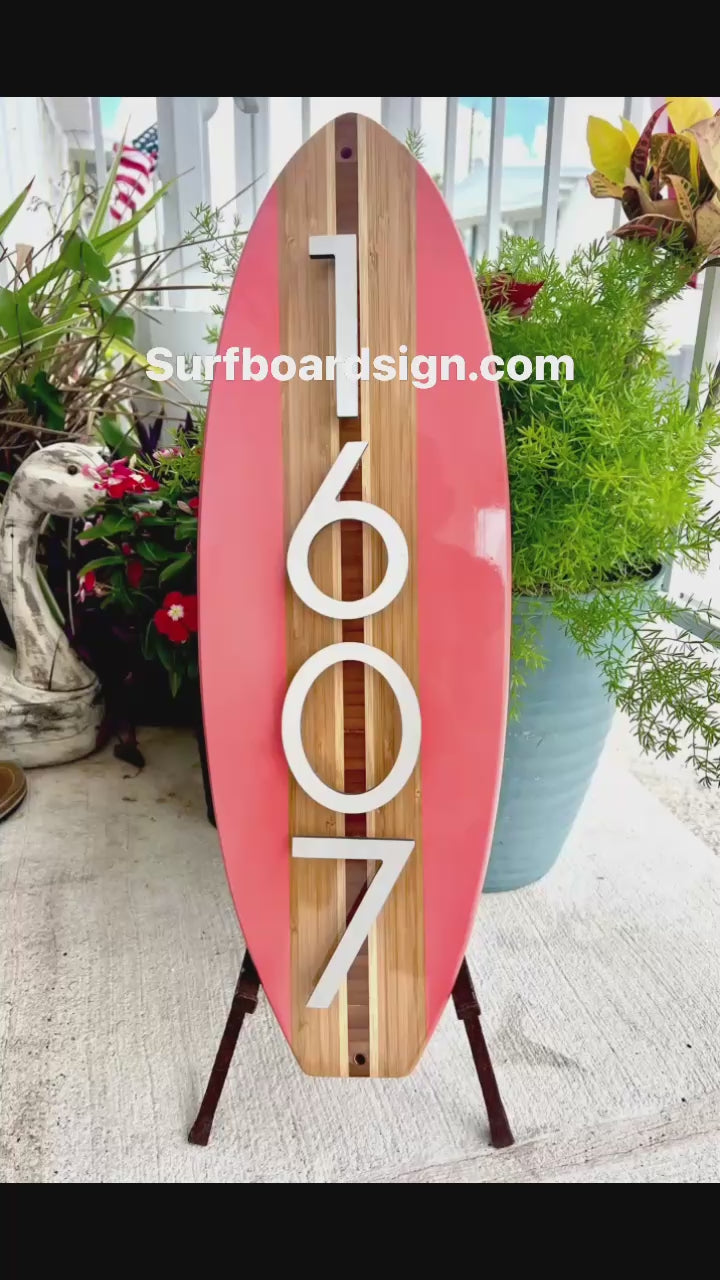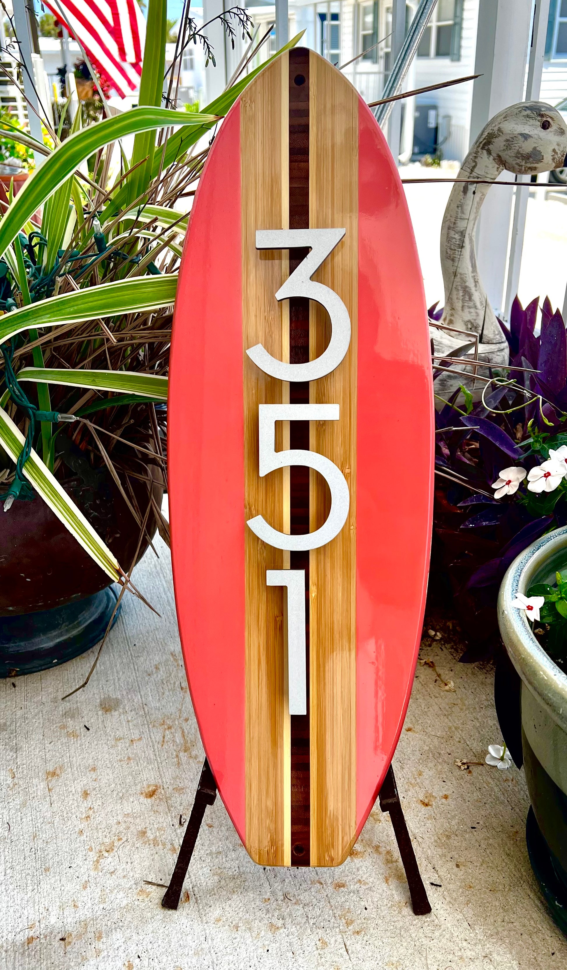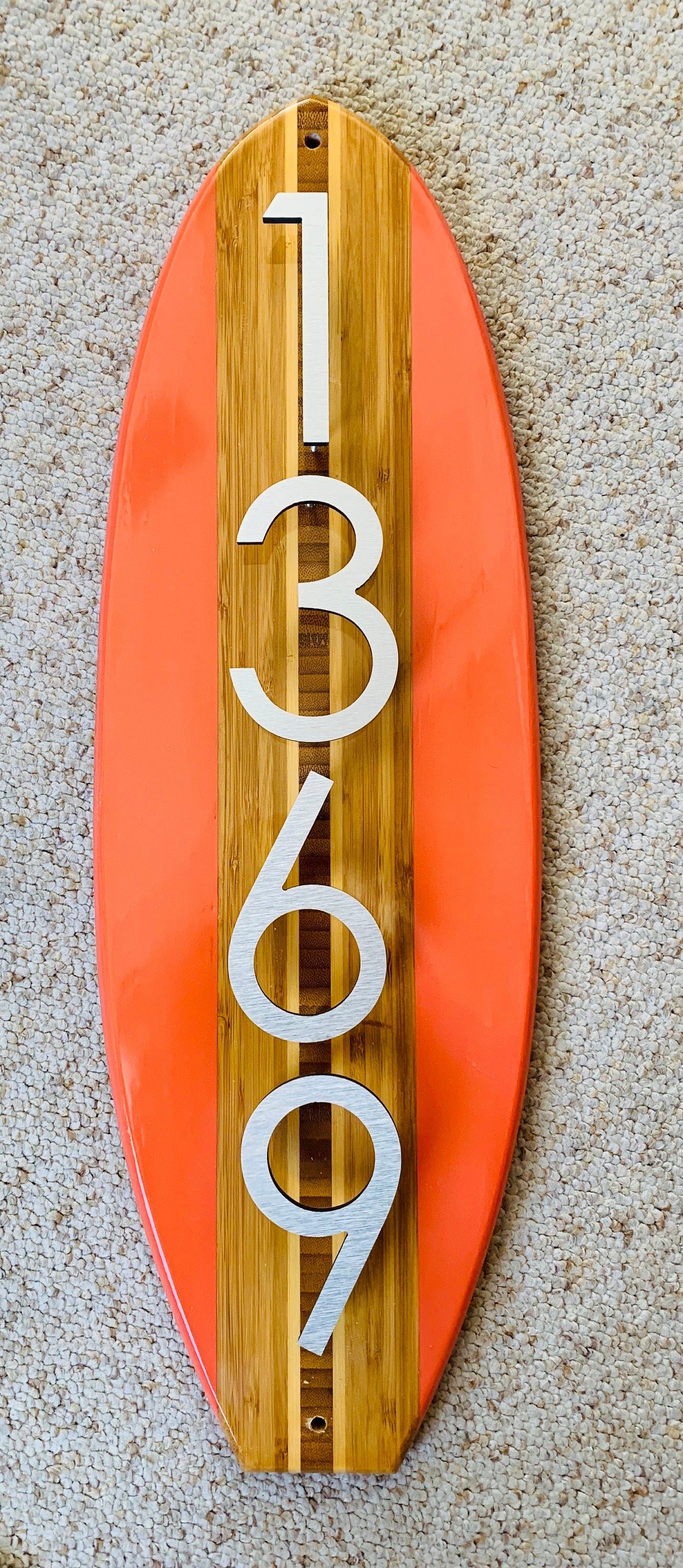 Address House Number Sign Surfboard Coastal Plaque in Salmon , brushed aluminum numbers or letters stand off from Board for pleasing 3D effect