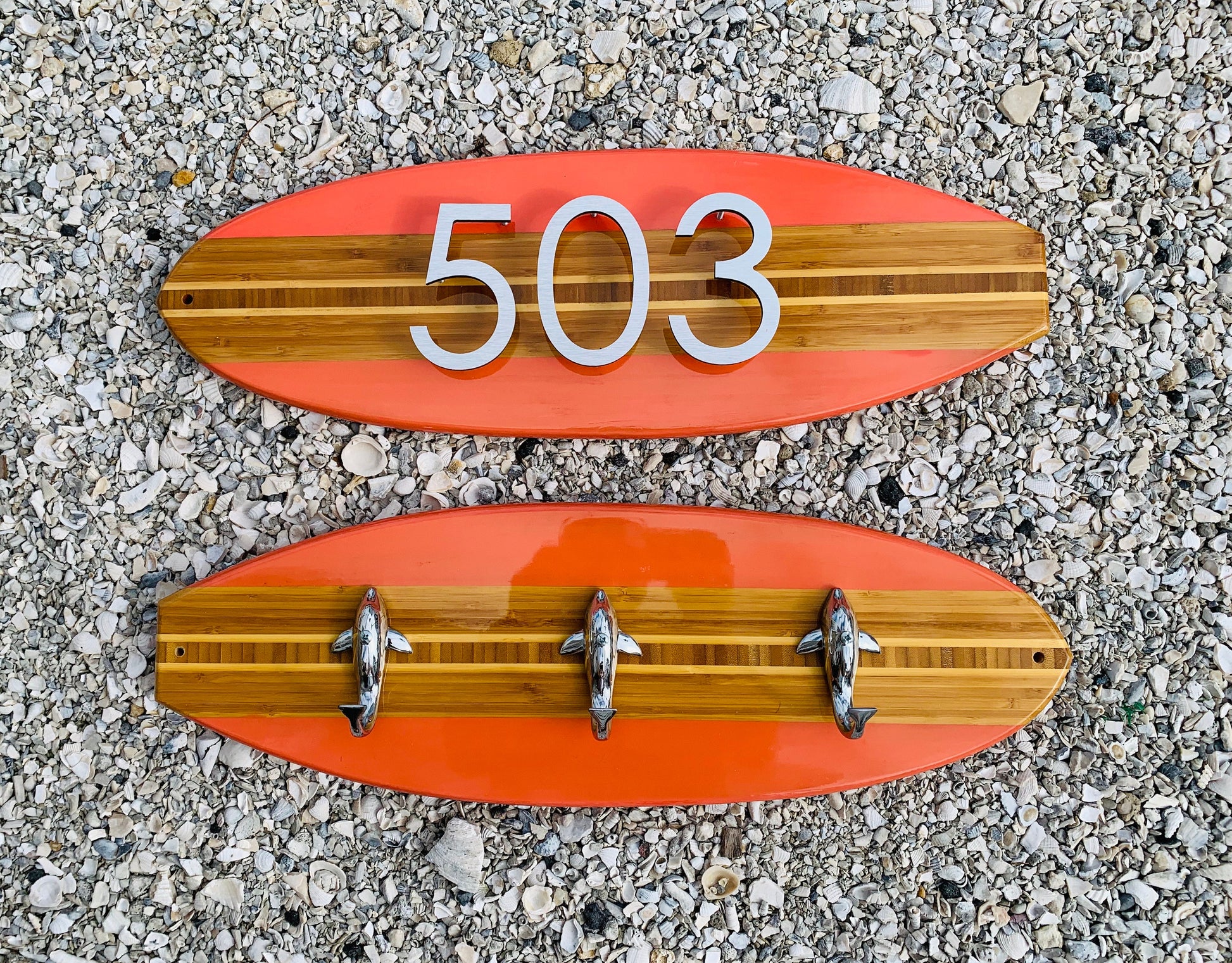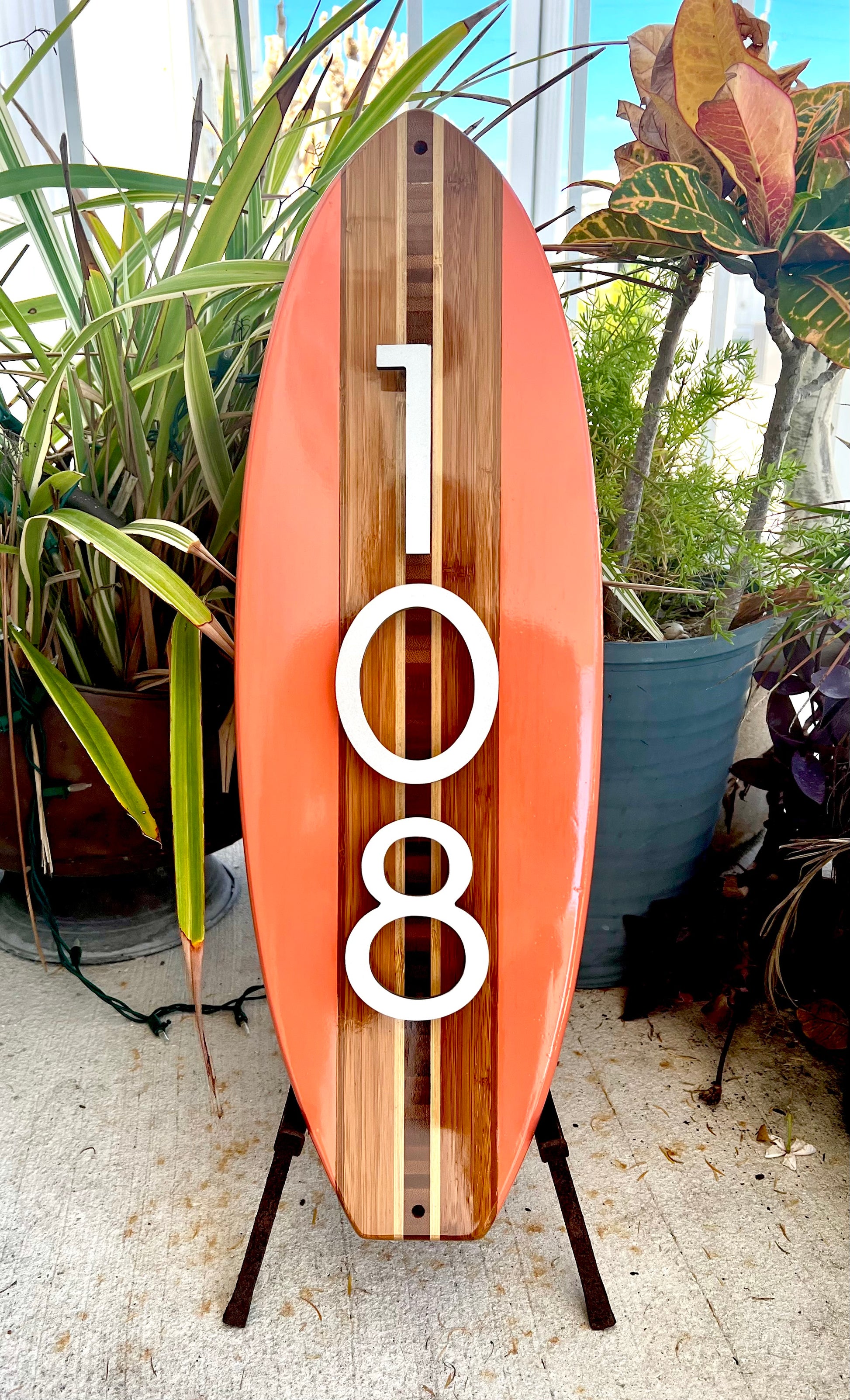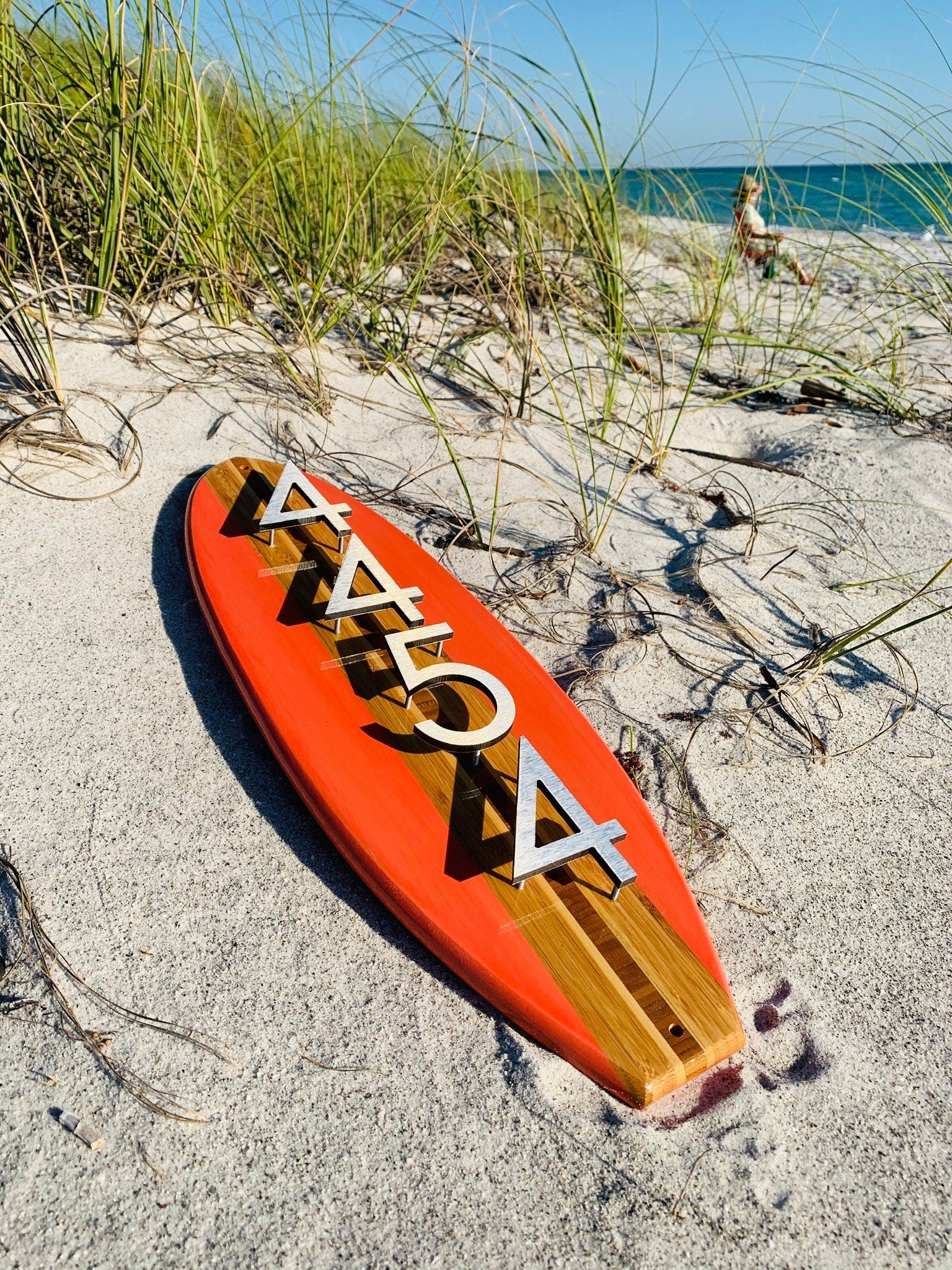 Address House Number Sign Surfboard Coastal Plaque in Salmon , brushed aluminum numbers or letters stand off from Board for pleasing 3D effect