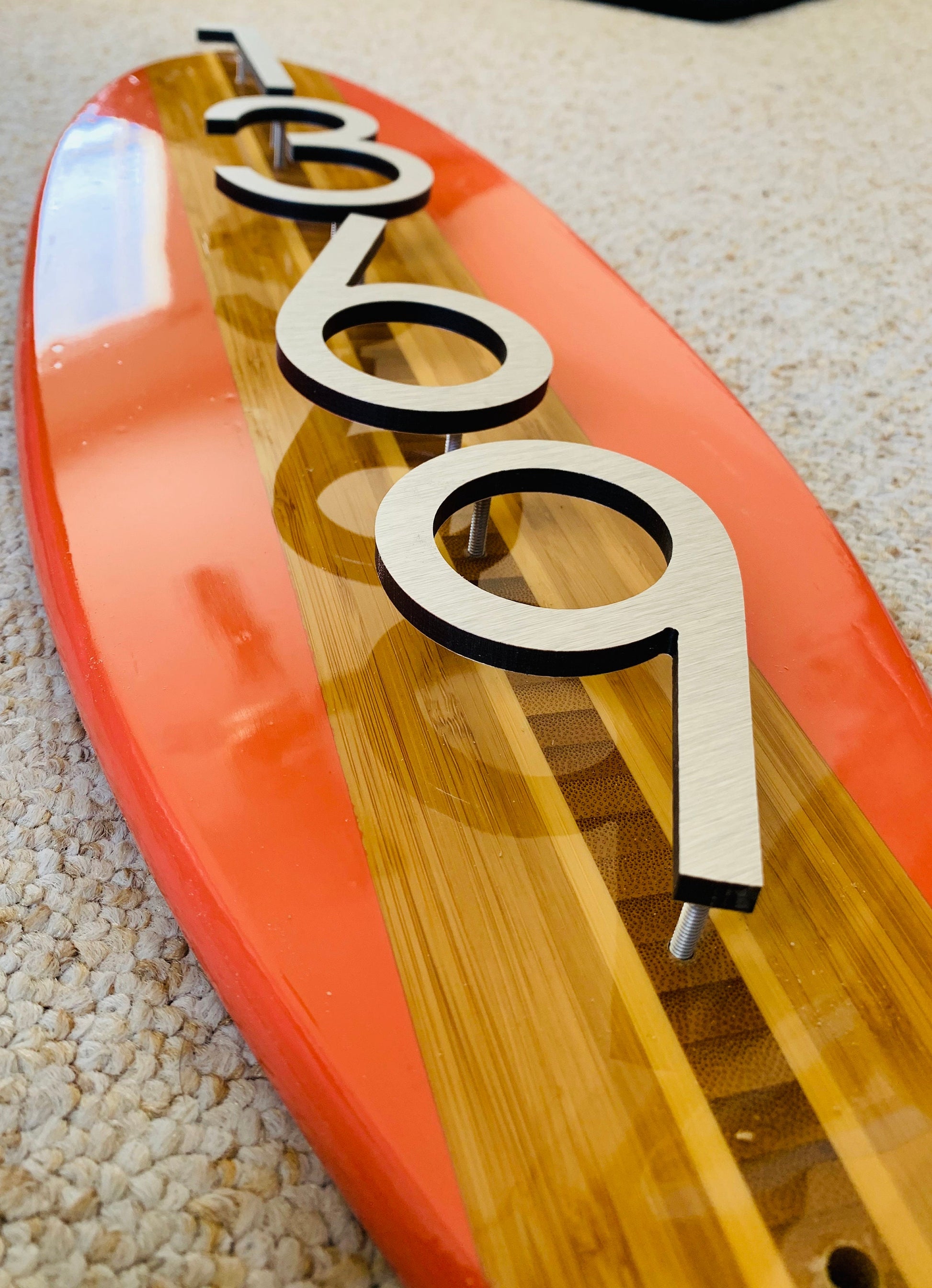 Surfboard House Number Sign , brushed aluminum numbers or letters stand off from
